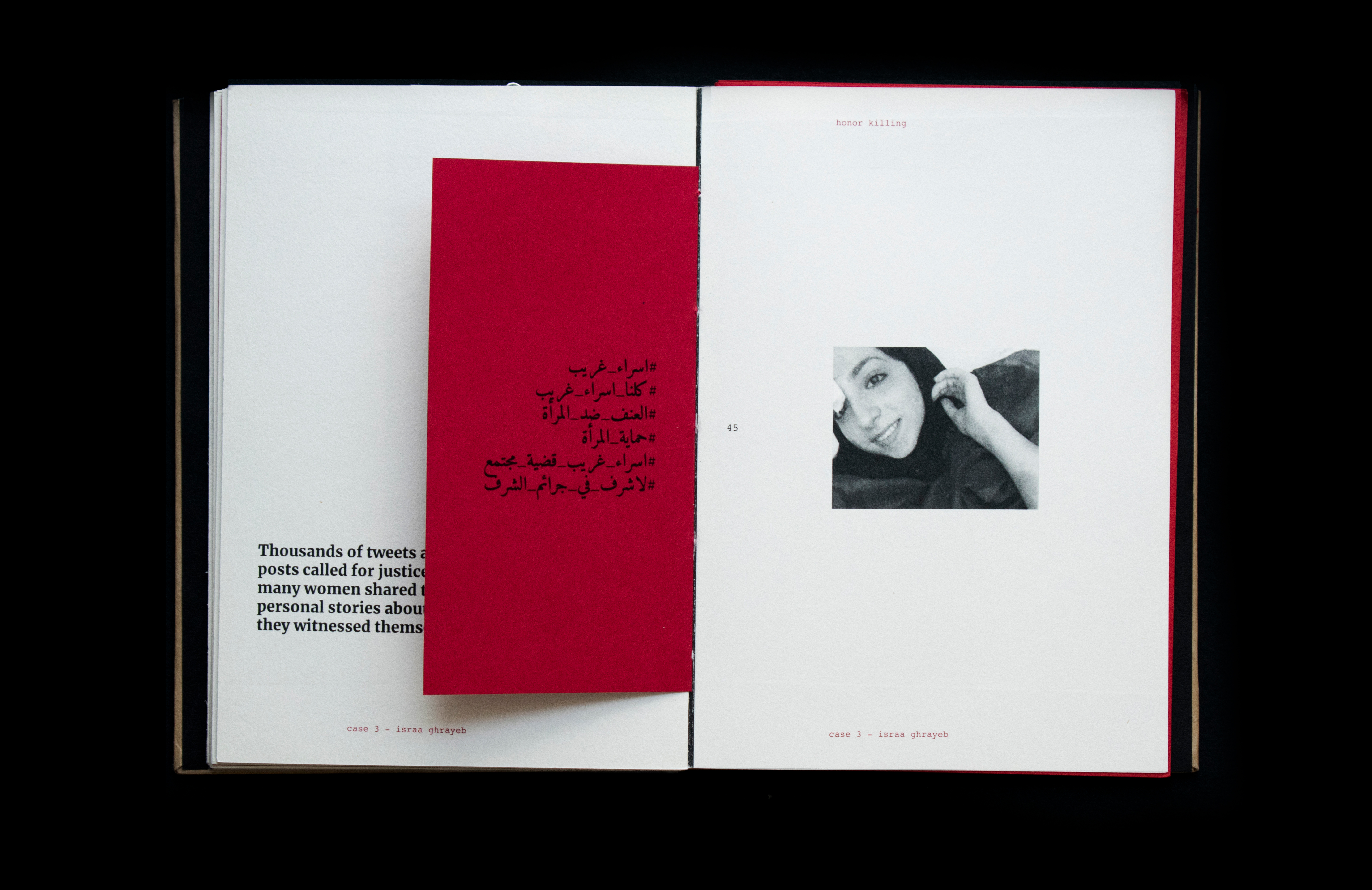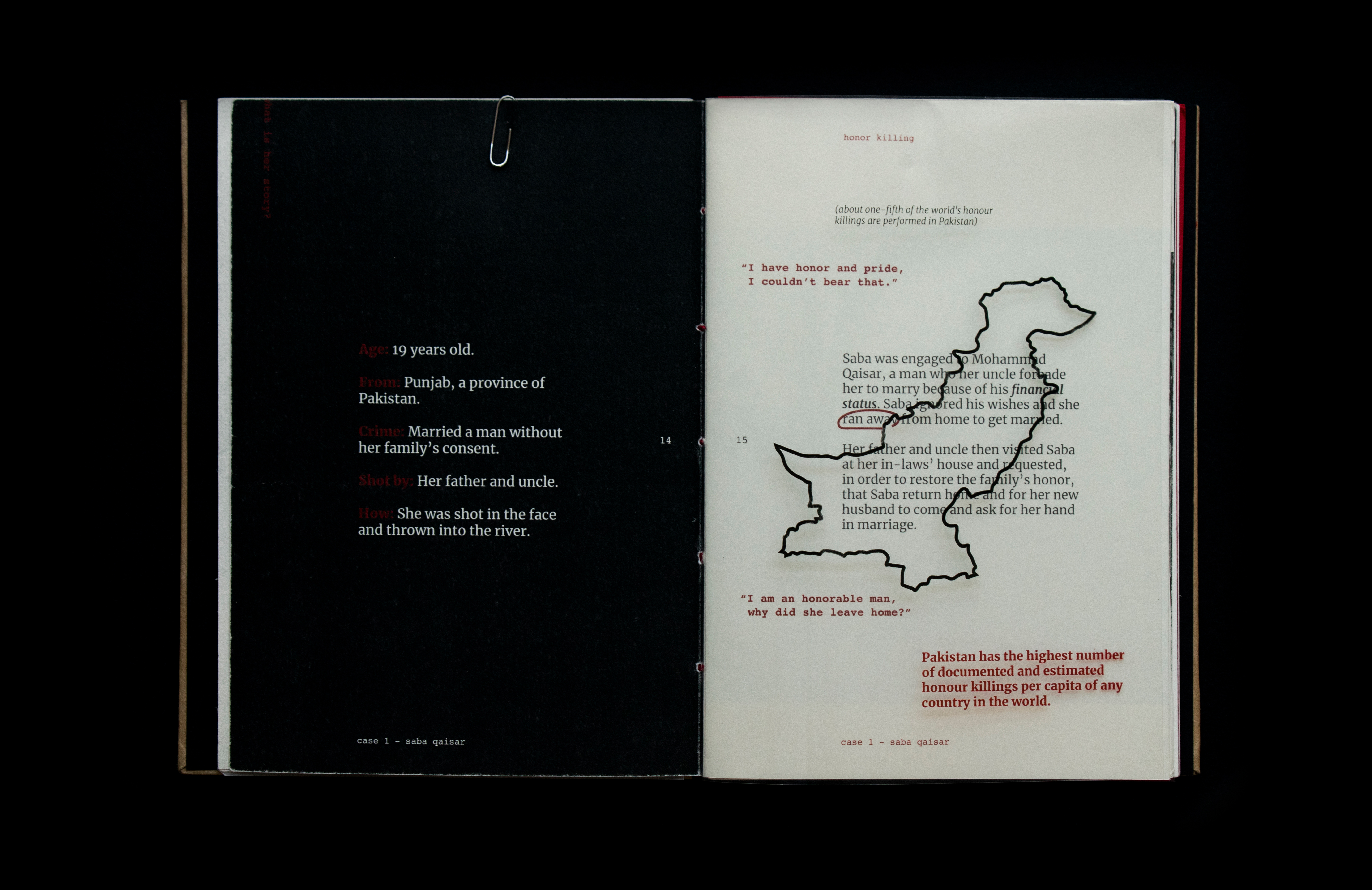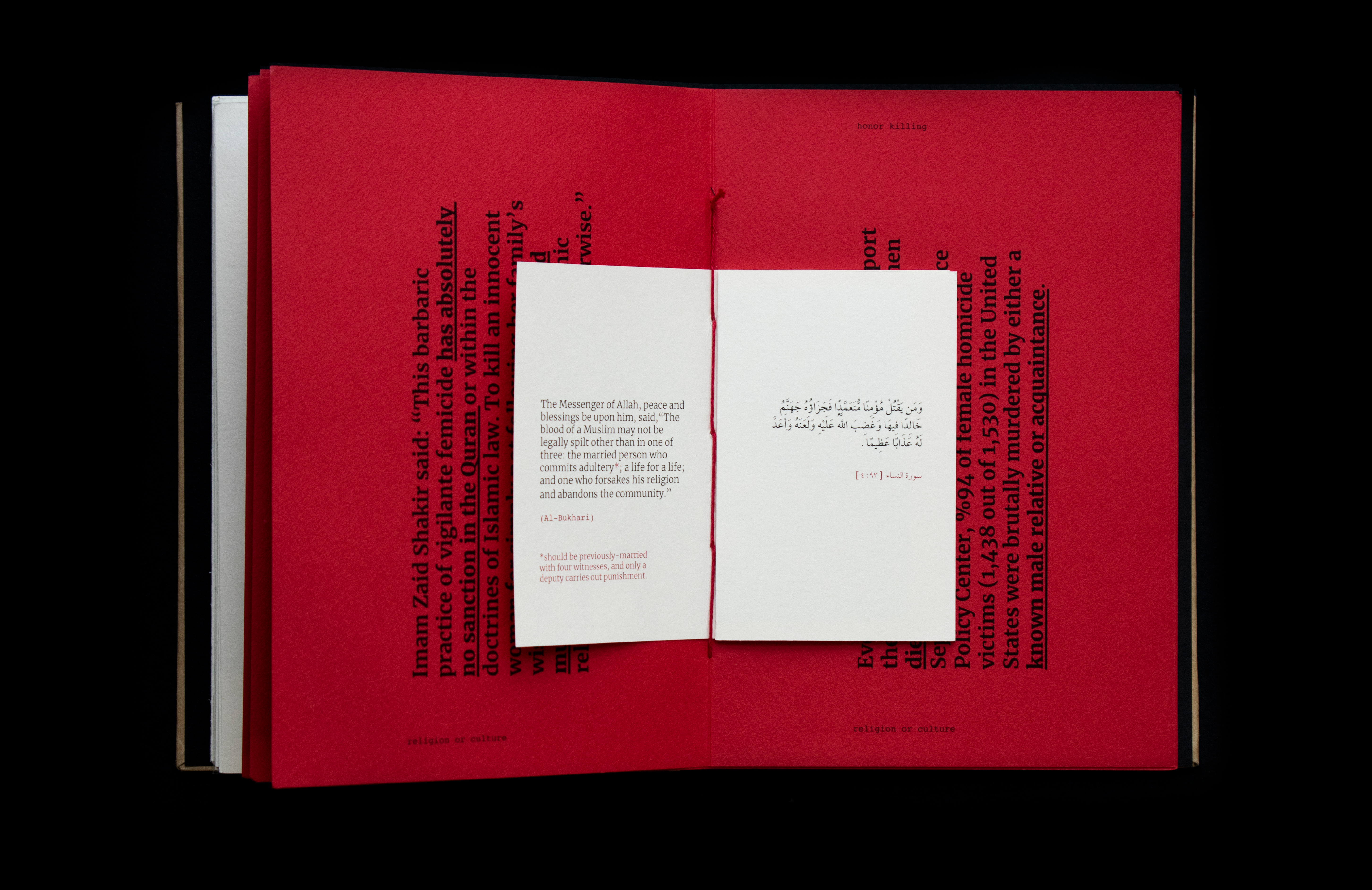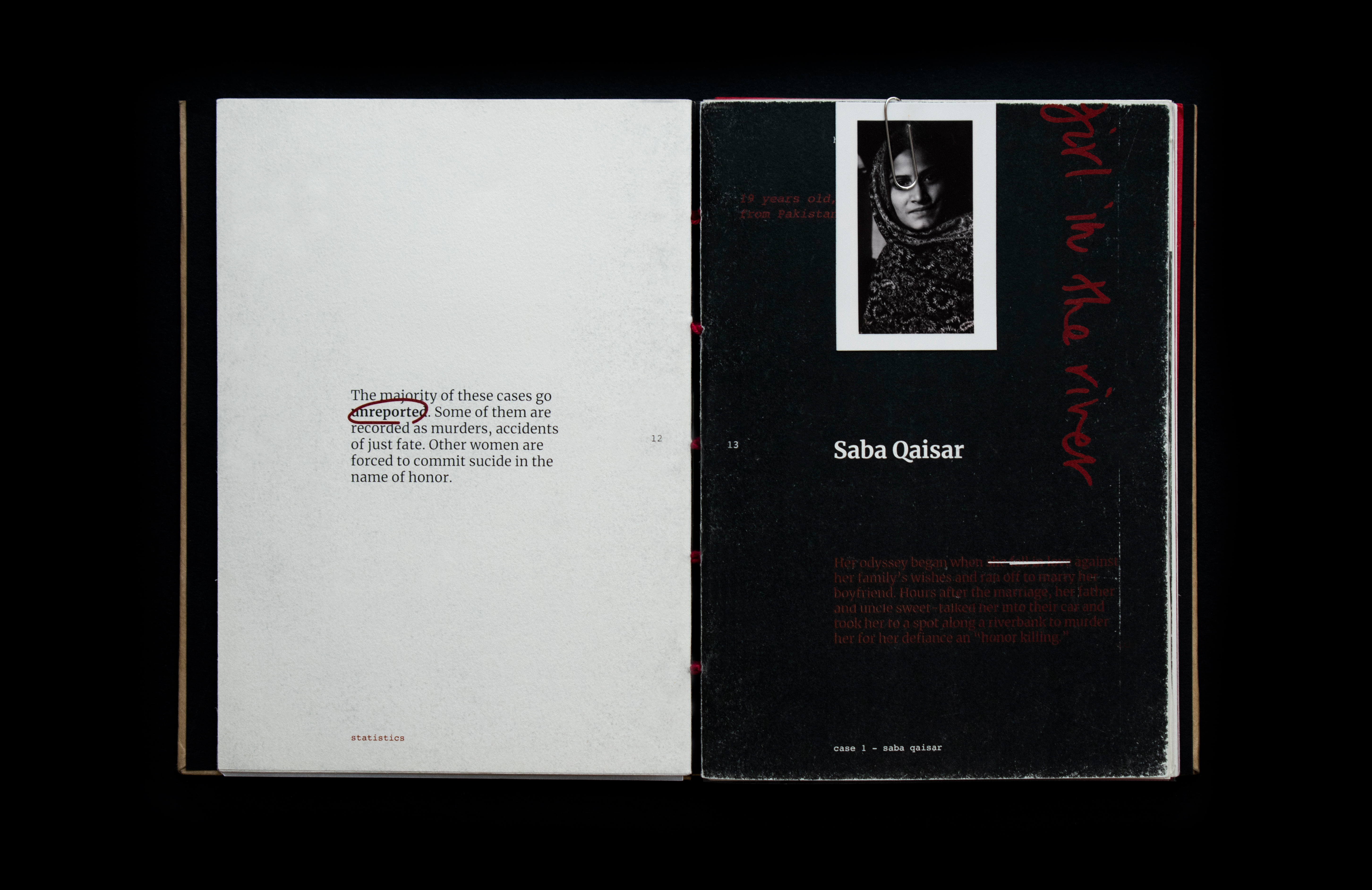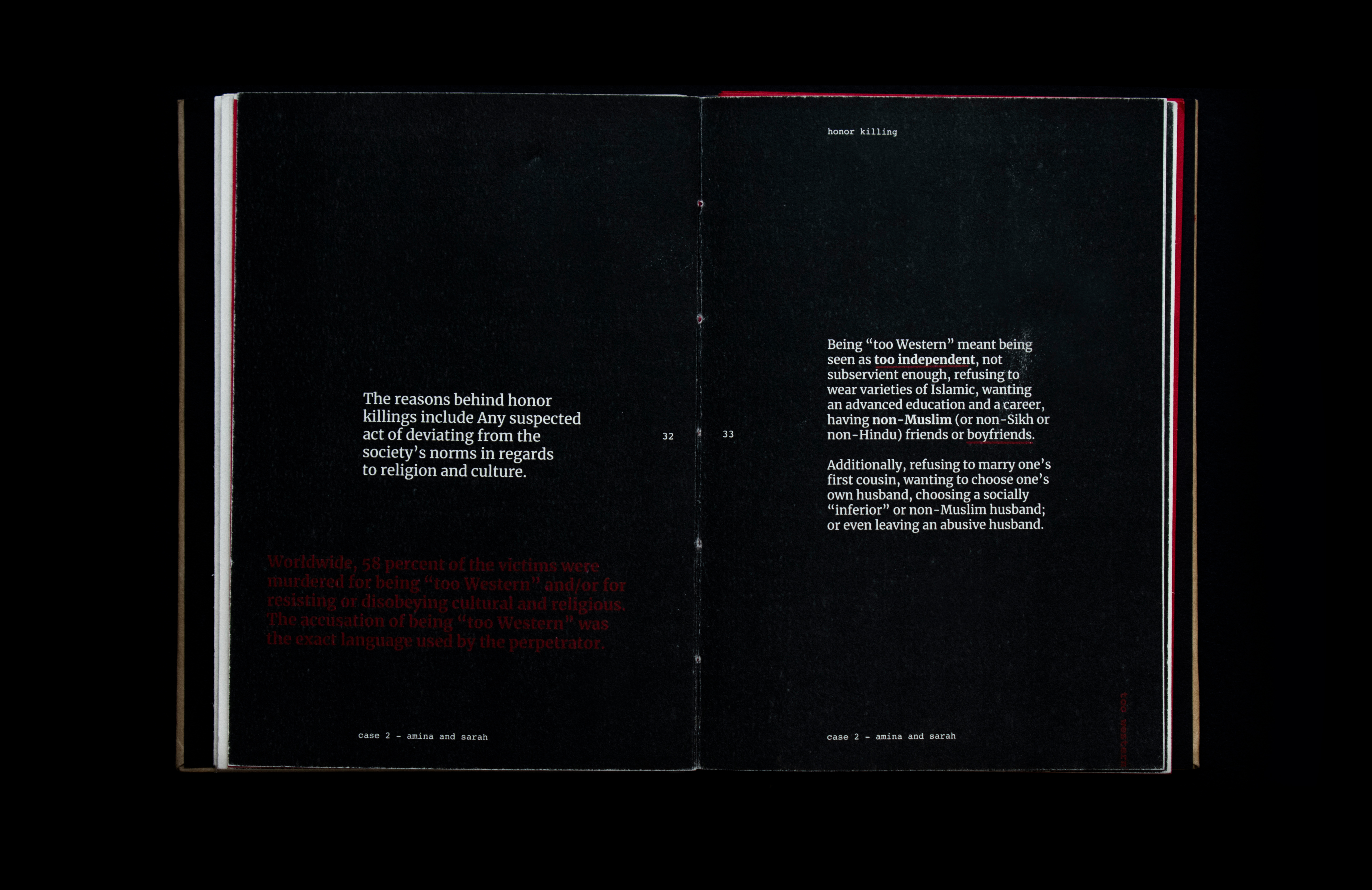 This book sheds light on the act of honor killing in the Middle East. Contrary to misconceptions, this prevalent crime is a reflection of patriarchal societies and is wrongly attributed to Islamic practices. The project features a few stories of victims’ and includes information that traces its origin and denies it’s connections and associations with religion. Drawing inspiration from actual criminal case records, the book's design incorporates diverse paper textures, typefaces, and annotations to create a compelling visual narrative.
