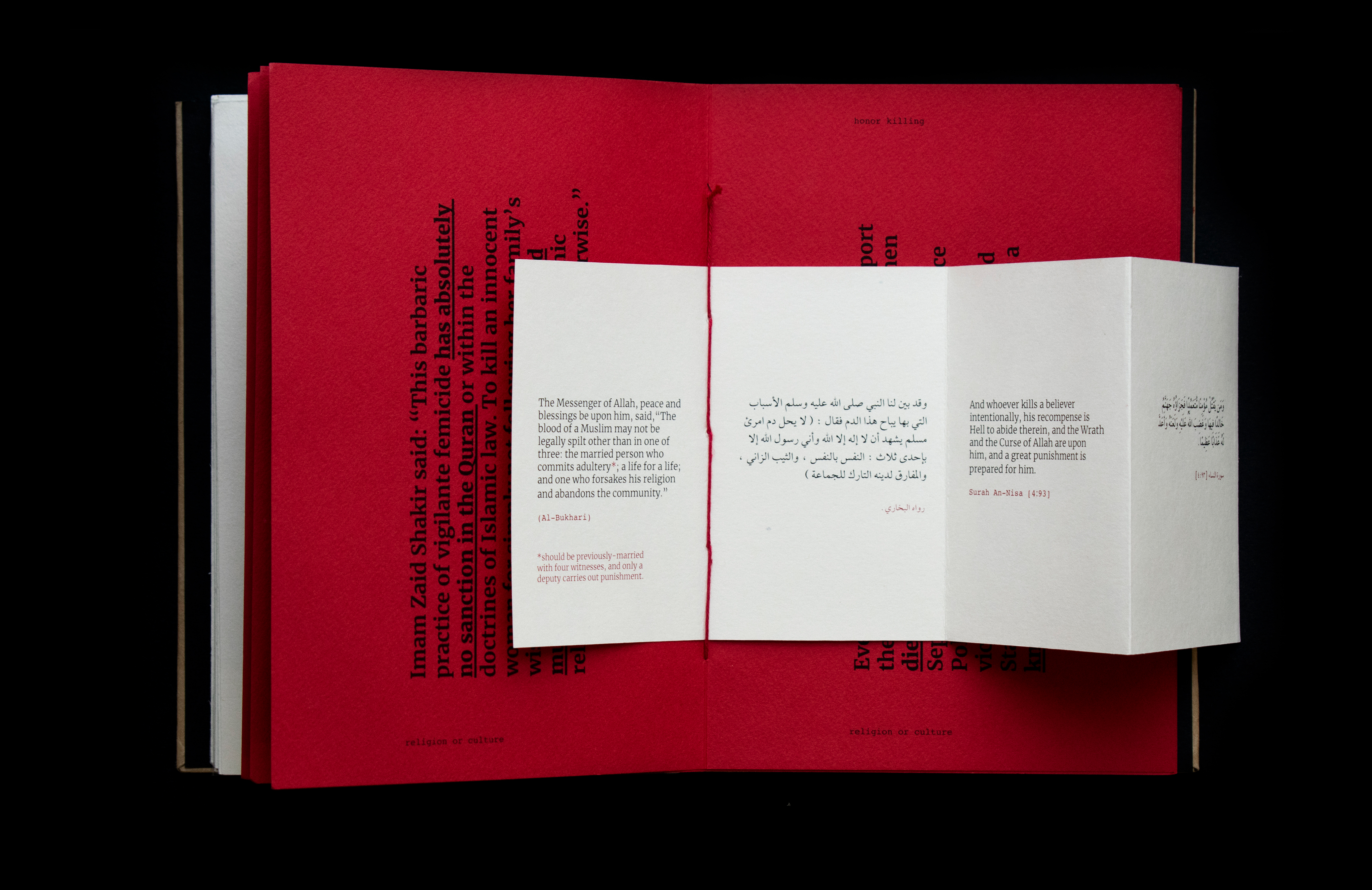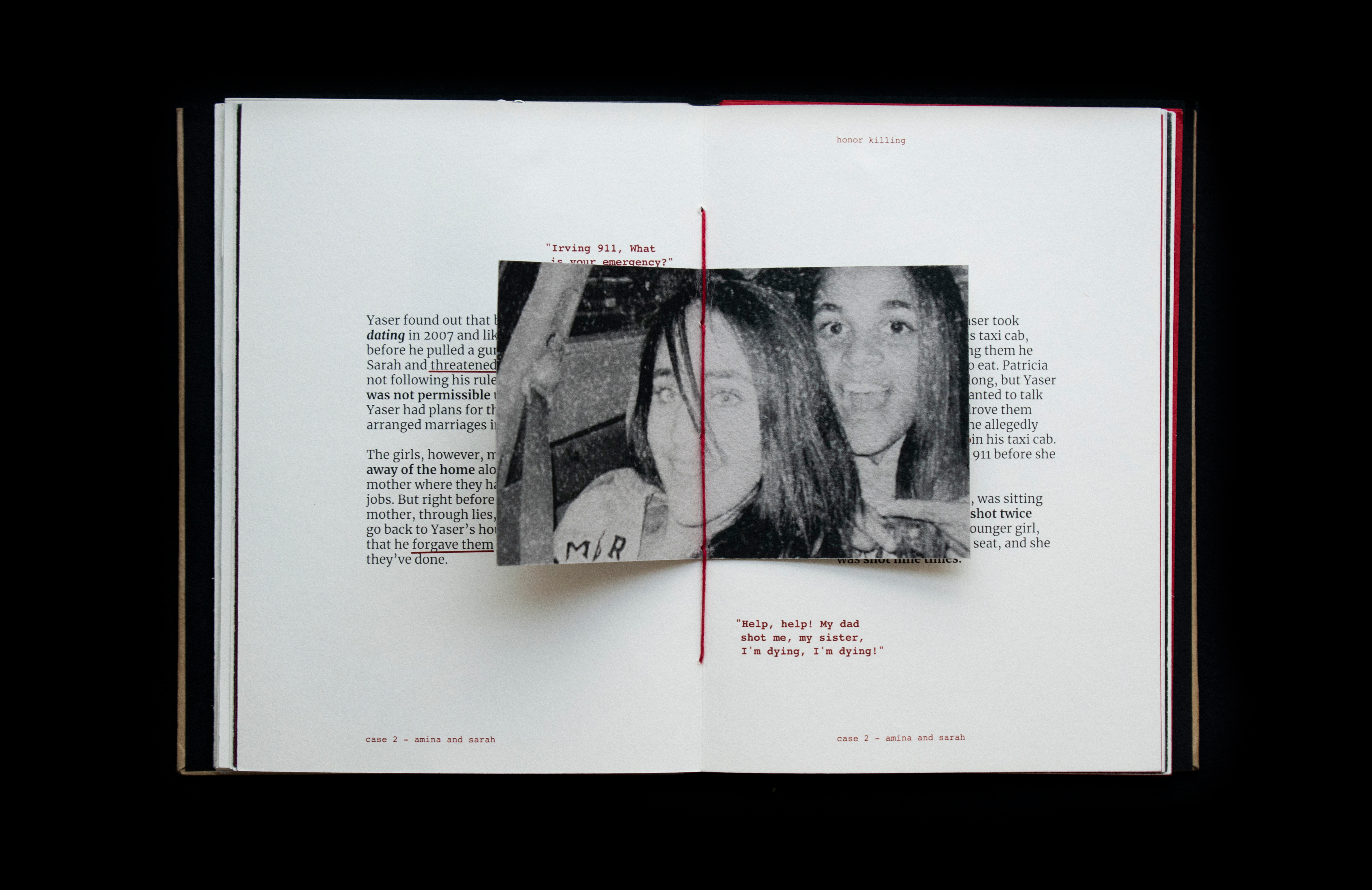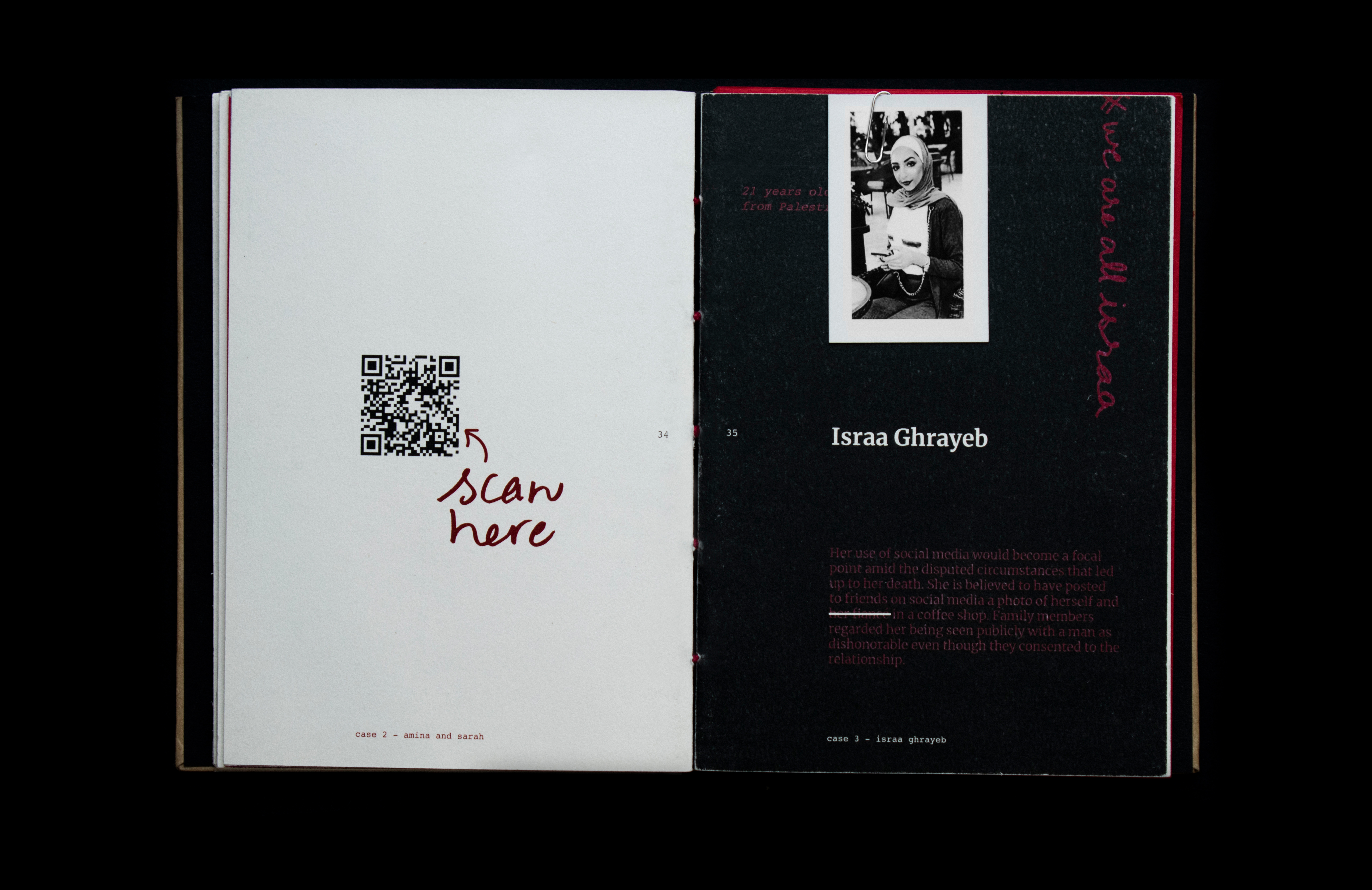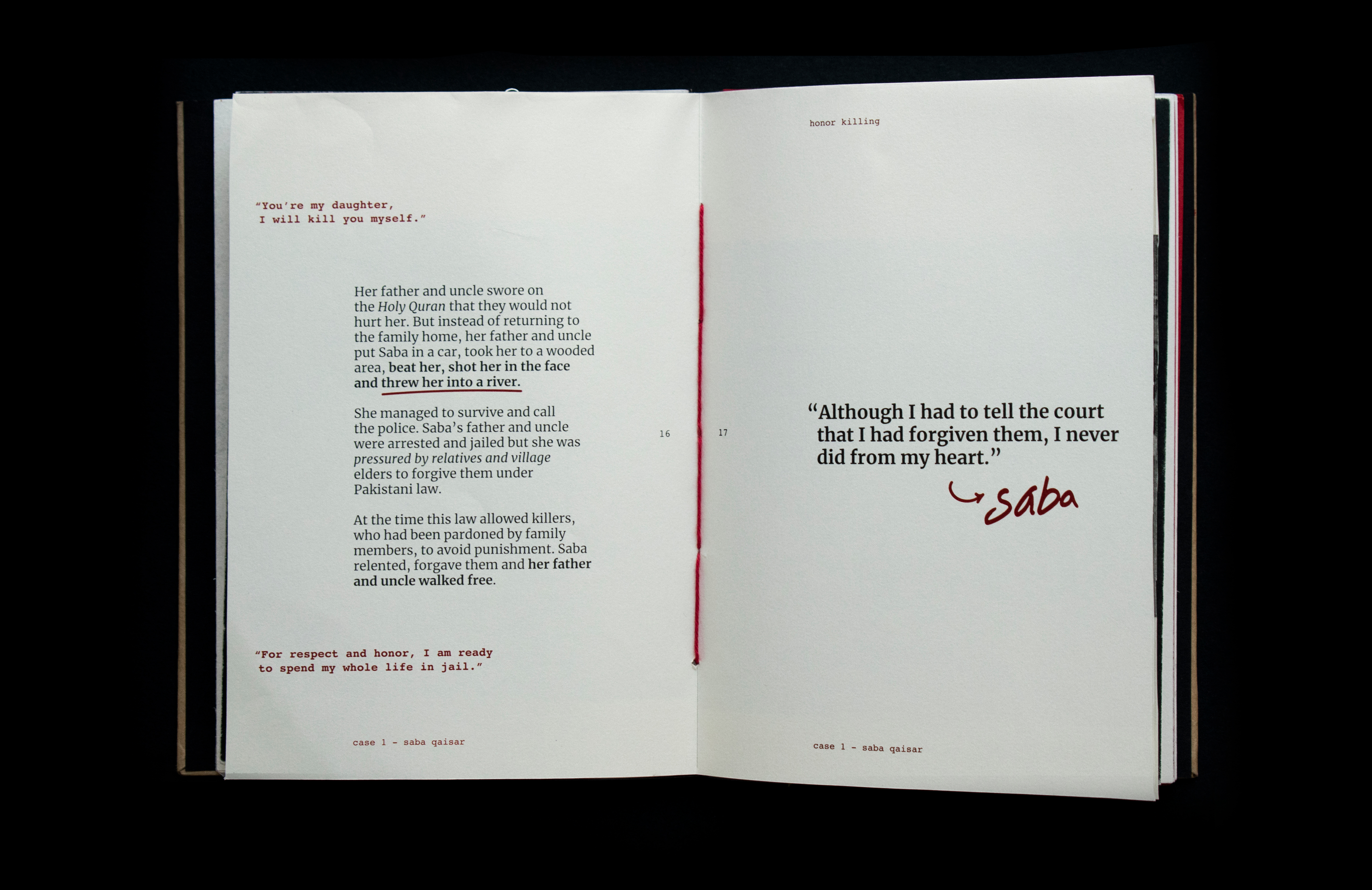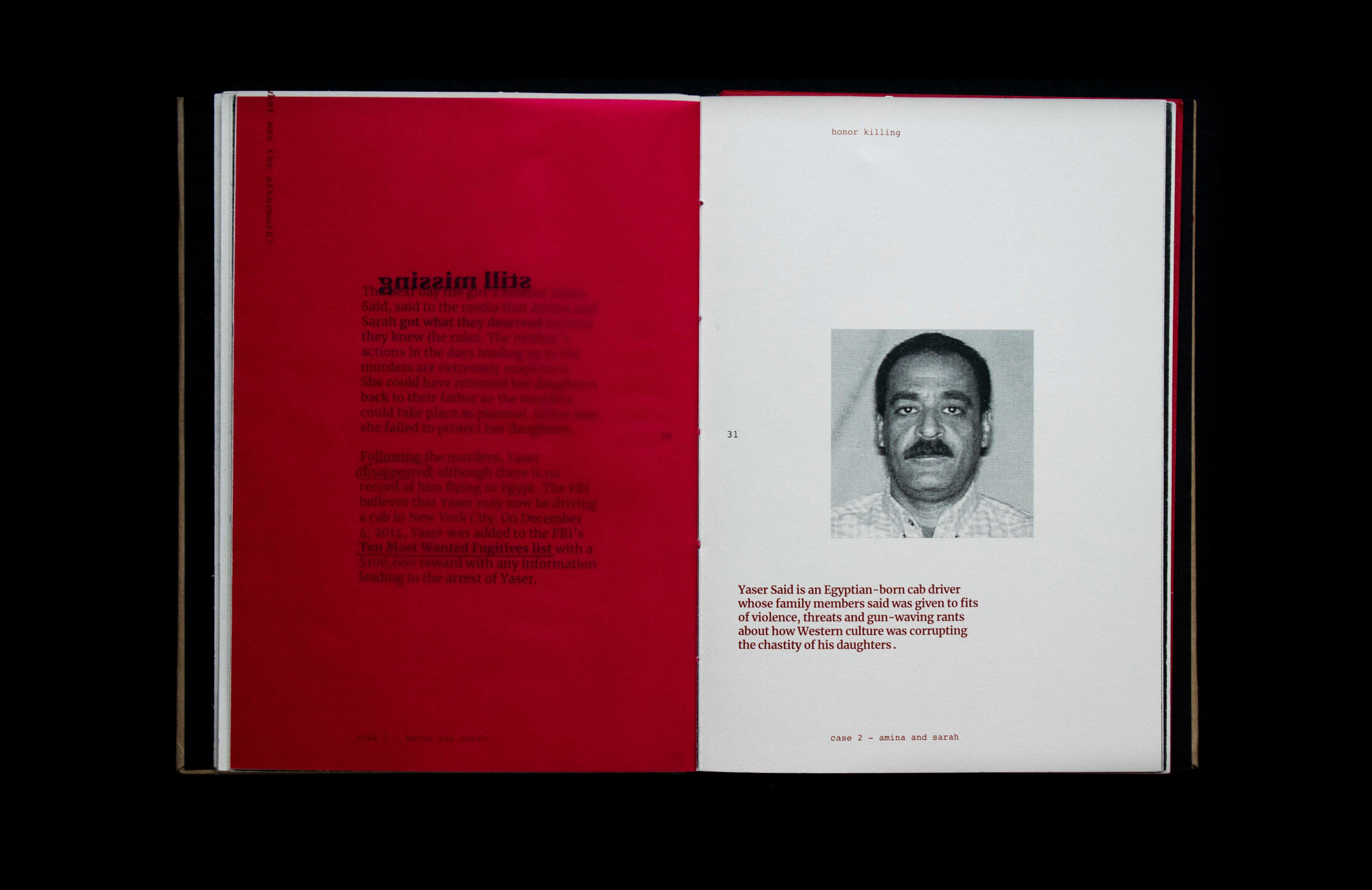 This book sheds light on the act of honor killing in the Middle East. Contrary to misconceptions, this prevalent crime is a reflection of patriarchal societies and is wrongly attributed to Islamic practices. The project features a few stories of victims’ and includes information that traces its origin and denies it’s connections and associations with religion. Drawing inspiration from actual criminal case records, the book's design incorporates diverse paper textures, typefaces, and annotations to create a compelling visual narrative.