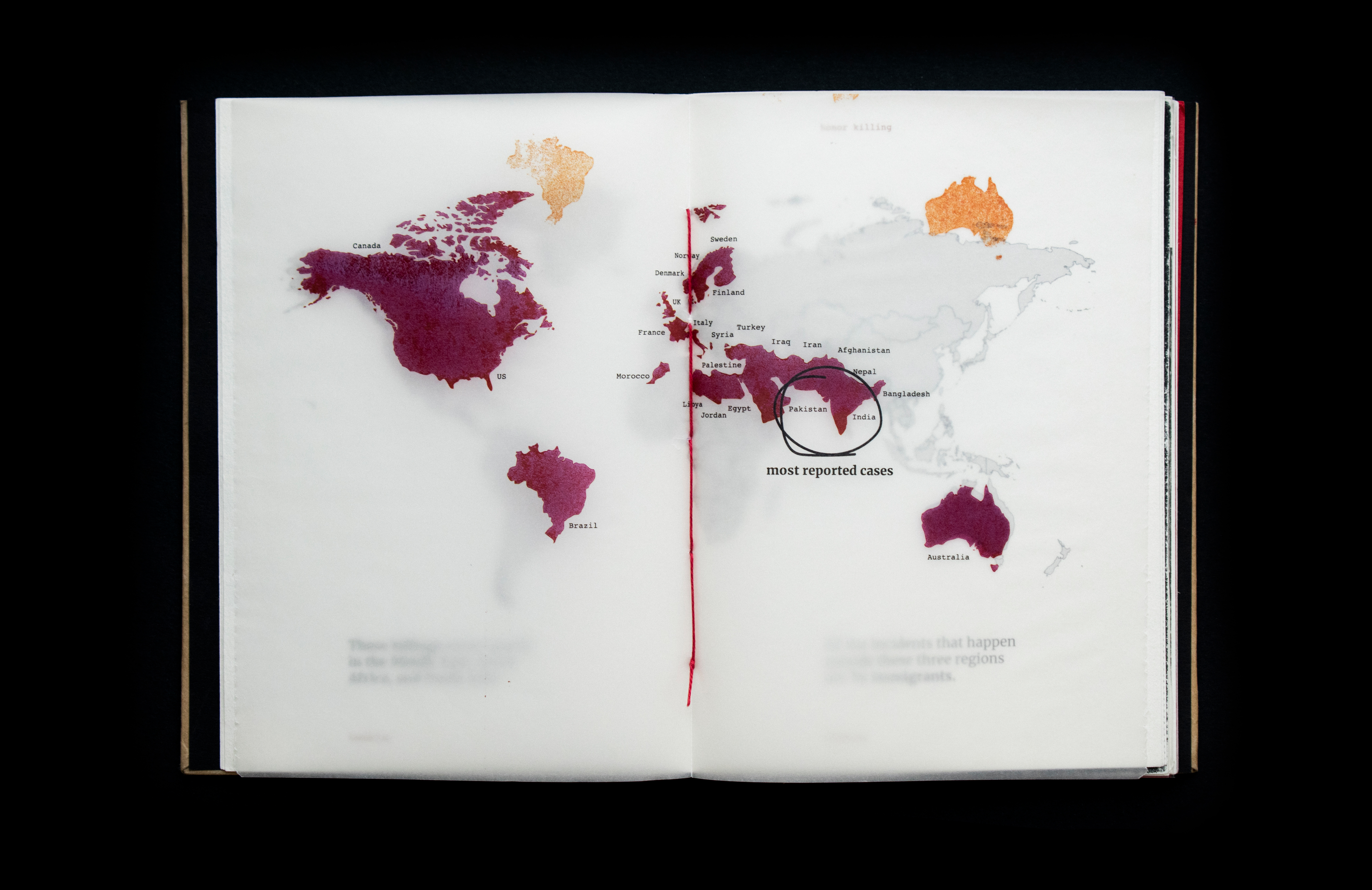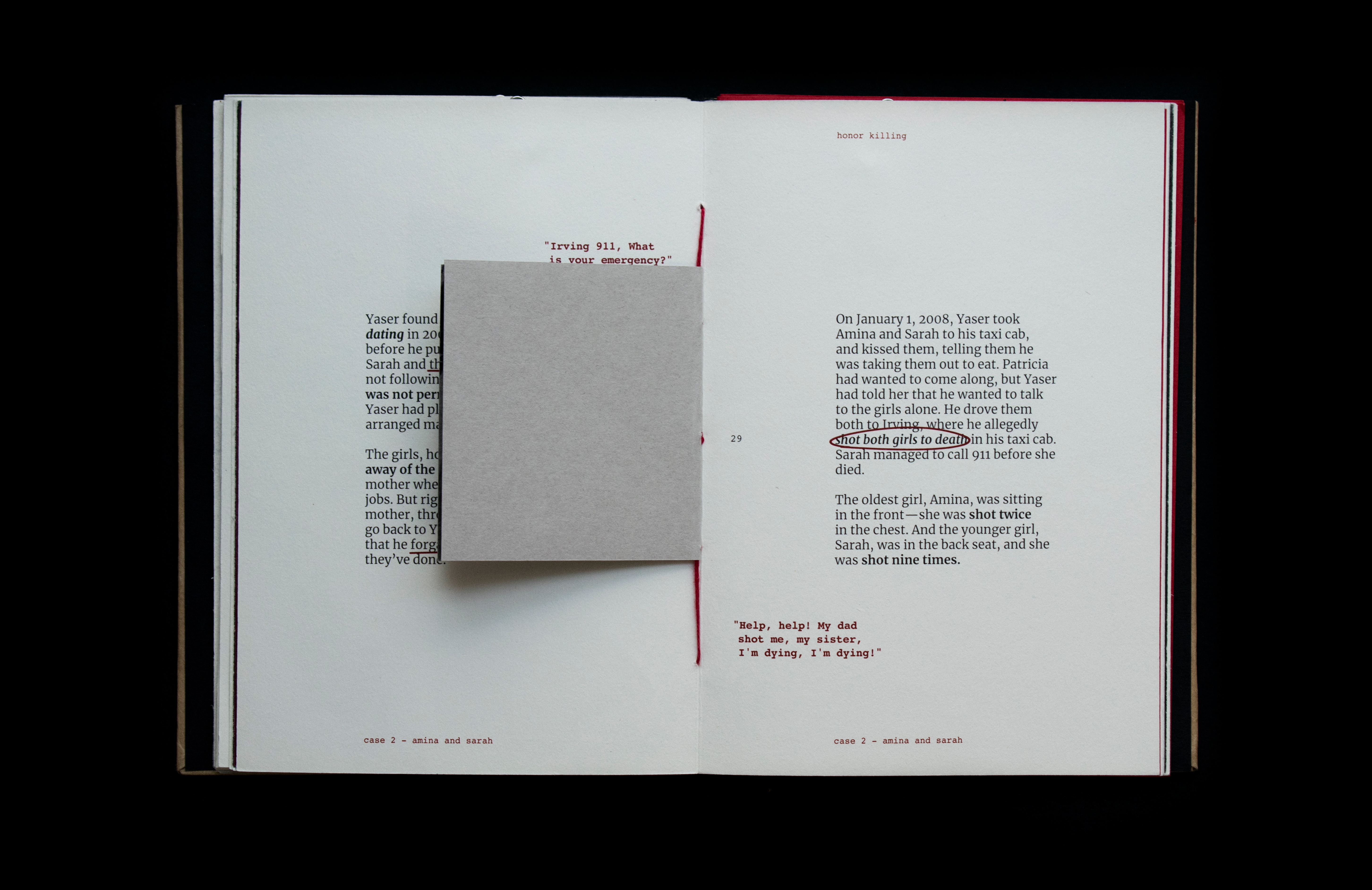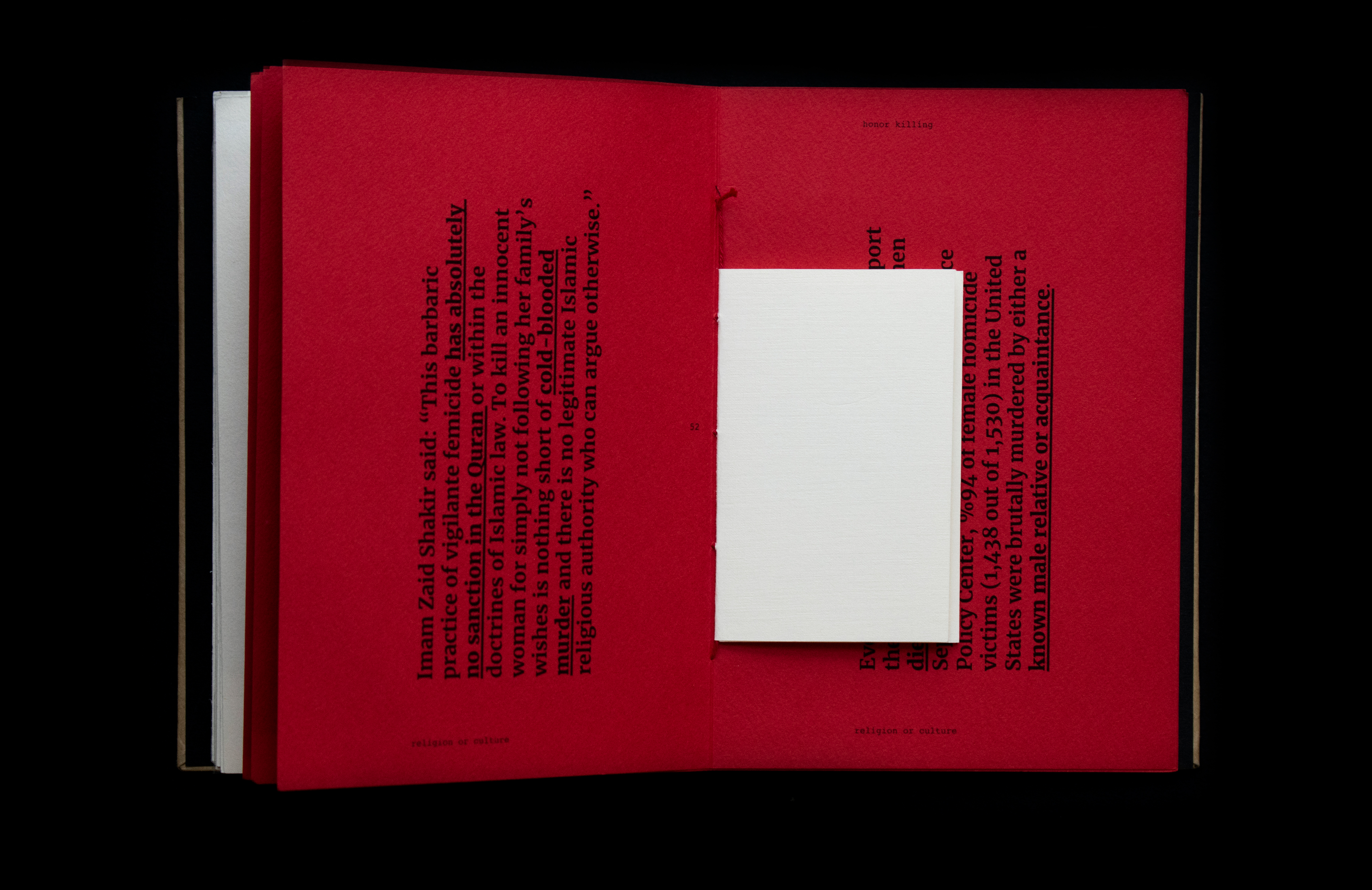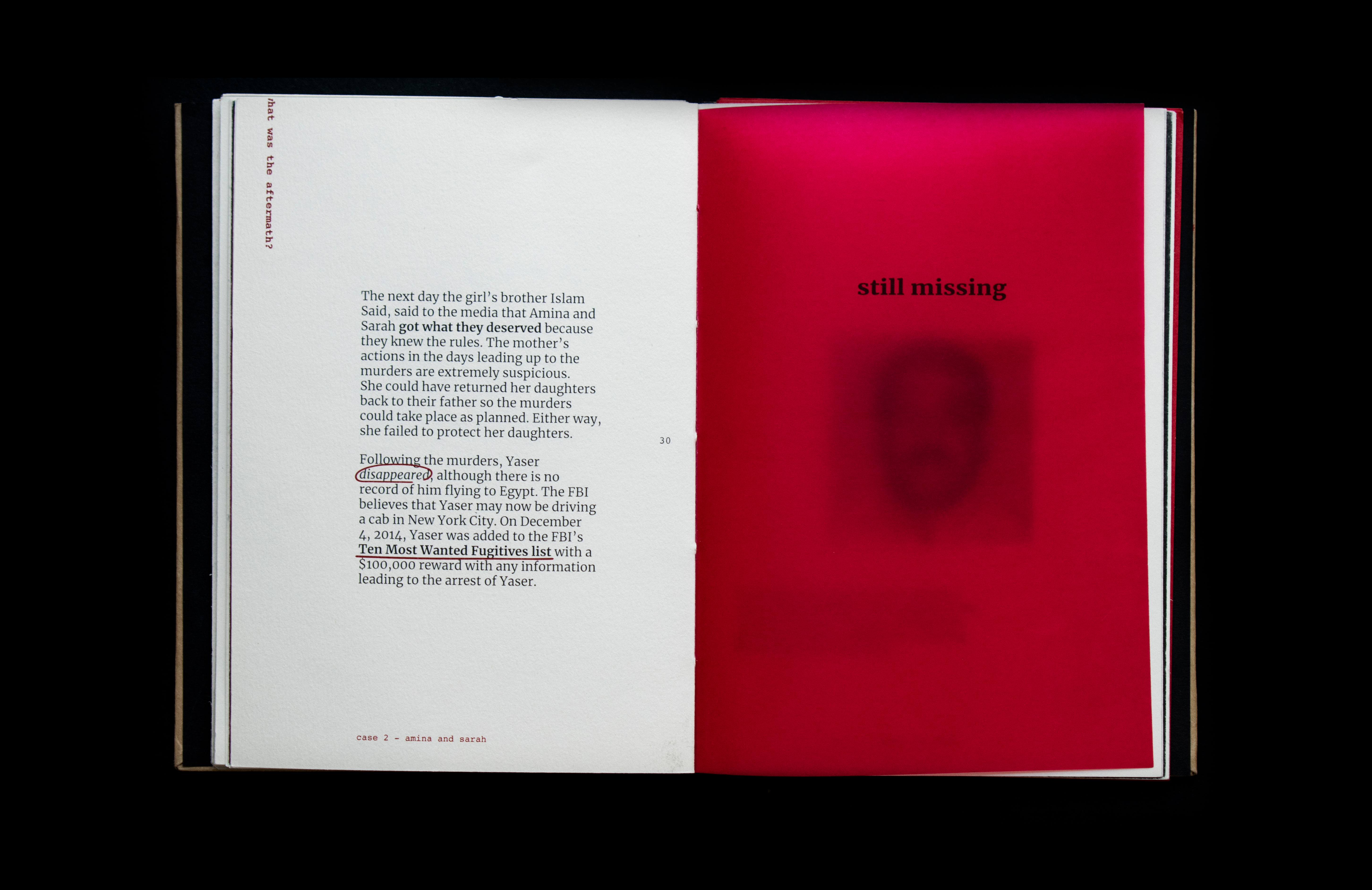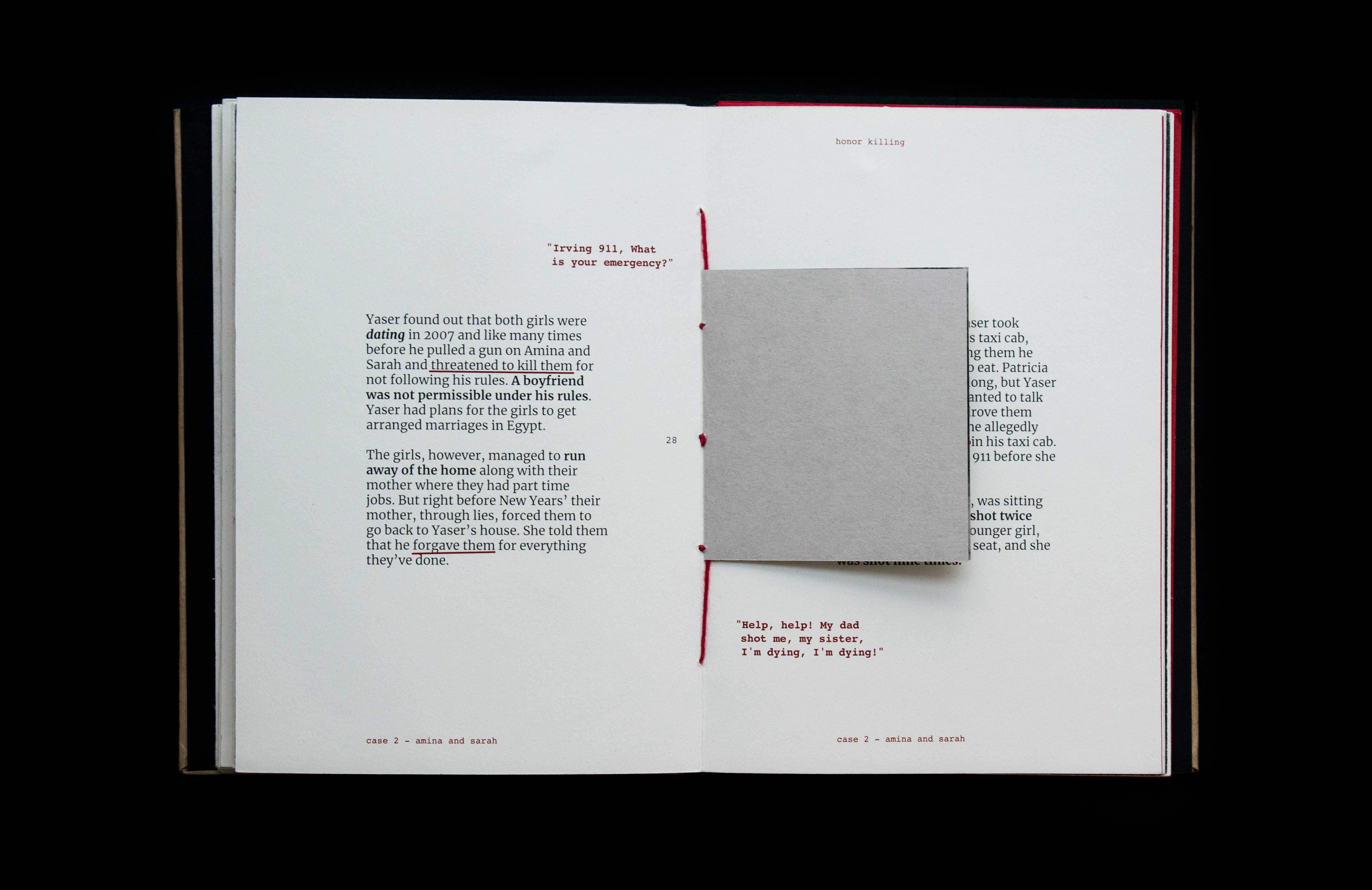 This book sheds light on the act of honor killing in the Middle East. Contrary to misconceptions, this prevalent crime is a reflection of patriarchal societies and is wrongly attributed to Islamic practices. The project features a few stories of victims’ and includes information that traces its origin and denies it’s connections and associations with religion. Drawing inspiration from actual criminal case records, the book's design incorporates diverse paper textures, typefaces, and annotations to create a compelling visual narrative.